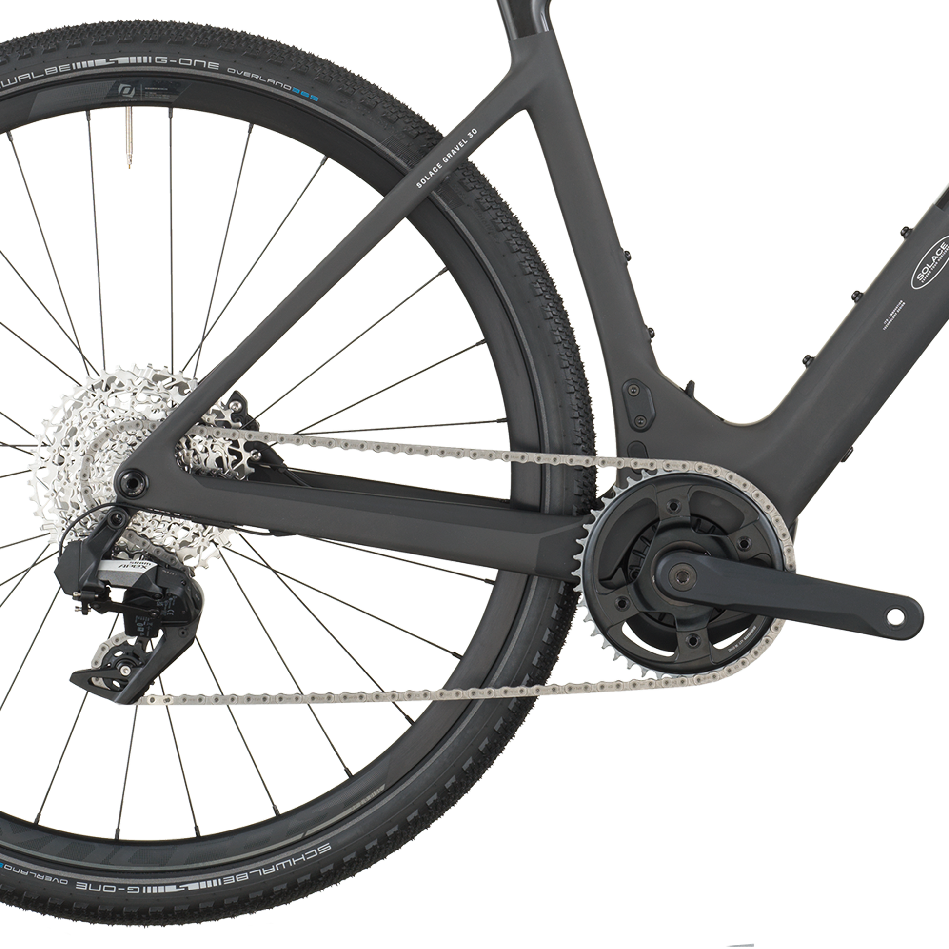 Controlling all the torque into forward propulsion are 50mm Schwalbe G-One Overland tires that provide critical traction on high-slip slopes and cushion to roll over rough terrain when you’re going flat out with Solace’s new powerband.